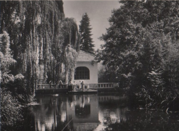 В середине озера небольшой островок. На него с обоих берегов перекинуты мостики с ажурными перилами, на краю островка растёт огромное дерево с длинными свисающими к самой воде ветвями. Это плакучая ива. Очень удачное название, смотришь и видишь, как дерево плачет своими ветками… Посередине каждой половинки озера маленький островок с красивыми кустами и цветами. В озере отражается небо и деревья на берегу. Это очень красиво. Мы бегаем по мостикам туда-сюда, потом решаем возвращаться к дому. Бежим вдоль берега и поднимаемся по крутой каменной лестнице вверх на гору. По узкой дорожке выходим к той же площадке, где мы встретились, но с другой стороны. Так началось моё знакомство с ребятами, которые на долгие годы стали моими близкими и хорошими друзьями.