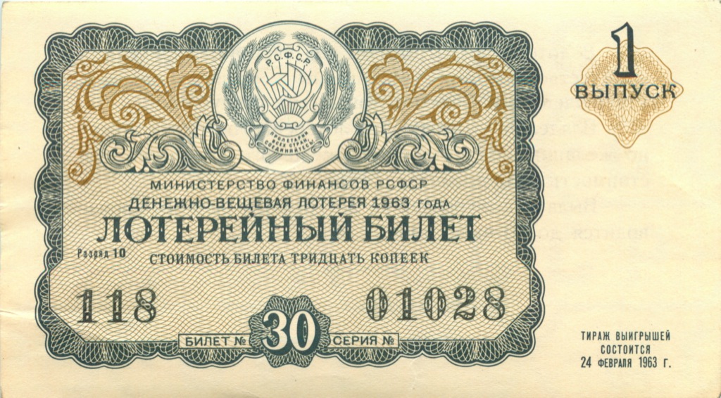 Лотерея. Ковёр. Телевизор. Декабрь. 1964 год. Мне на день рождения мама подарила лотерейный билет за 30 копеек. Его ей дали в магазине на сдачу. Мы положили его в сервант на полочку и забыли. А позавчера вышла таблица розыгрыша и мама его проверила… Я вернулся из школы и, как только вошёл в дверь, понял, что что-то случилось – мама шла мне навстречу и улыбалась. Она меня поцеловала и сказала, что мой билет выиграл ковёр. Мы, как и практически все другие граждане СССР, часто покупали лотерейные билеты. Они были нескольких видов – обычные денежно-вещевая