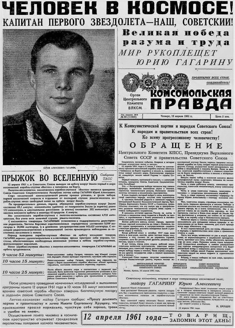 12 апреля. 1961 год. Гагарин. Сегодня среда. Ясный солнечный день. Я уже дома, хотя по времени ещё должен быть в школе. Прямо во время уроков нас дружно вывели на общую линейку. Вся школа построилась по классам перед школой, и наш завуч Борис Васильевич объявил, что занятия на сегодня отменяются в честь того, что в космос на ракете полетел наш человек. Его имя Юрий Гагарин. Все очень обрадовались и дружно закричали Ура! Мы прыгали, кричали и веселились. Учителя по очереди выходили вперёд и говорили, как это здорово и ещё много разных слов.